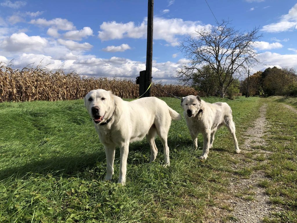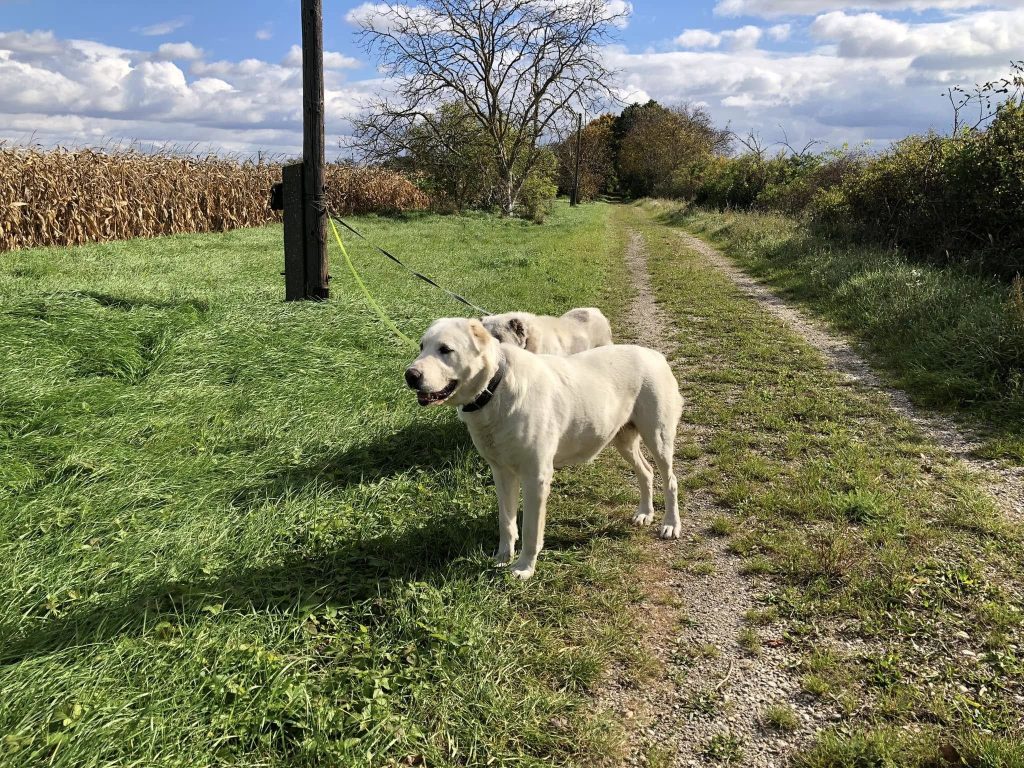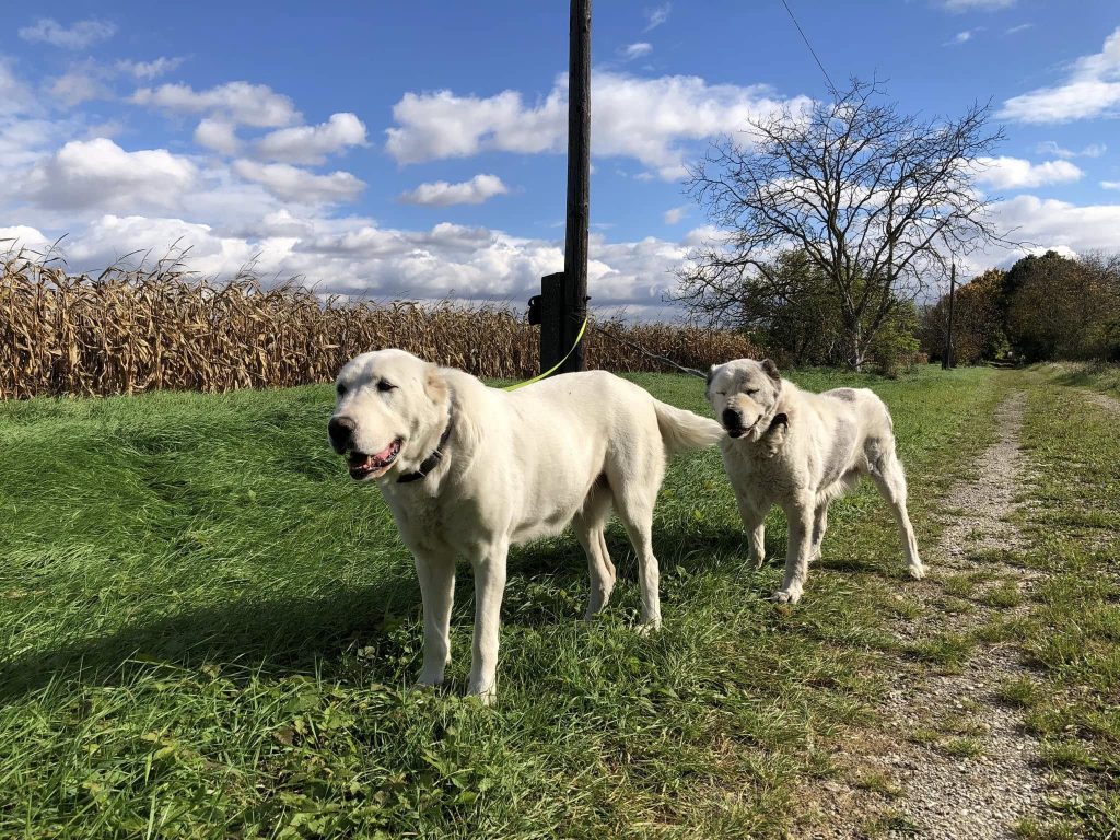 Keď mi to čas čo i len trošku dovolí, ideme na prechádzku. Najčastejšie beriem Dorinku, tej to robí dobre na peristaltiku, aj psychicky jej prechádzky robia dobre, špacírovala by v sveta kraj – len tie jej pacinky už toľko nevydržia chodiť, už sa aj potkne, keď si nedá pozor, takže na prechádzkach je to ona, ktorá udáva tempo, čiže ideme pomaličky, z nohy na nohu, občas zastavíme, späť ísť však ani za svet, na obligátne „Otočíme!“ žiadna reakcia, ťapká si tvrdohlavo ďalej po cestičke… musím ju prehovárať, aby sa otočila, začínam sa domnievať, že ísť späť tou istou cestou je v psačom svete dáka potupa či čo… Mišelka vie, že okolo Dori sa točí svet, tá mi naprieky nerobí 🙂